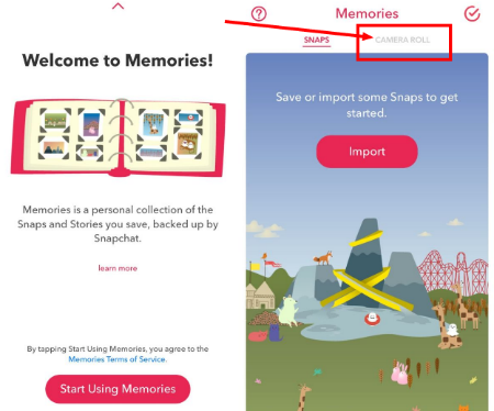 To upload saved videos to snapchat select camera roll.